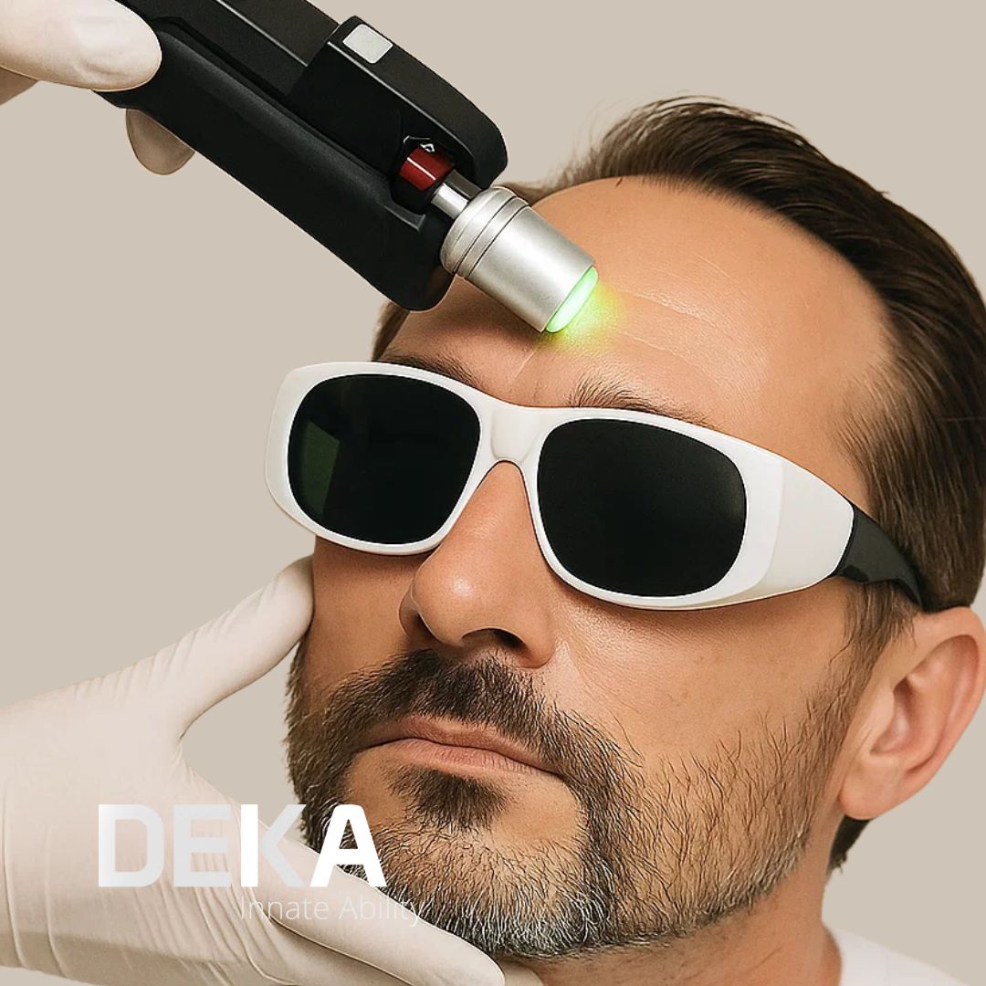 DEKA® AX Alexandrite-laser sender presist lys mot hårsekken, absorberes av pigmentet, varmer opp roten og ødelegger den for varig hårreduksjon for menn.
